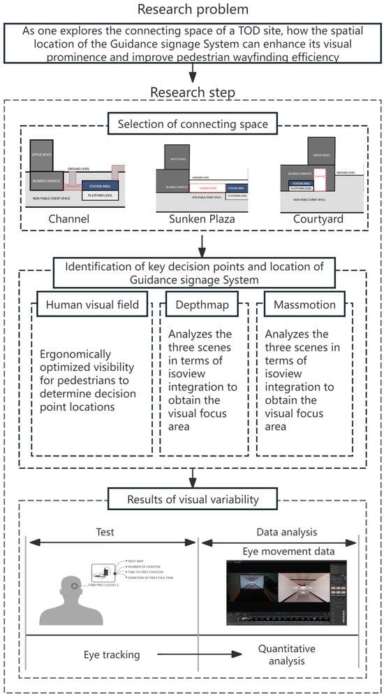 This study analyzes the effect of the spatial location settings of the guide signage system on the visual salience of pedestrians at TOD sites. The steps of the study are shown in Figure 4.