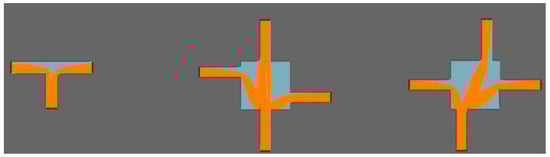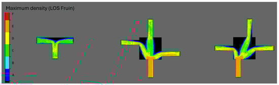 In this paper, we first employ the spatial syntax software Depthmap10 to analyze the three kinds of connecting spaces in terms of their visual domain before subdividing the spatial plan into a grid, which covers the entire 2D visible area, and when setting the grid size, we balanced the calculation precision and the amount of operations, referring to the research of Zhou Xi [37] and others, selecting a grid size of 1.0 m (the common size is 1–1.5 m). The structure of the visual integration degree calculation is shown in Table 3, where the redder the color, the higher the visual integration degree, which indicates the greater visual visibility of the space. Secondly, the Massmotion11.5 software is used to simulate the passenger flow routes in the three connecting spaces (Figure 6 and Figure 7), and the ground-based Guidance Signage System is laid out in such a way as to avoid the passenger flow routes as much as possible. The results of the visual field analysis of the three kinds of spaces calculated by Depthmap and Massmotion software are shown in Table 3.