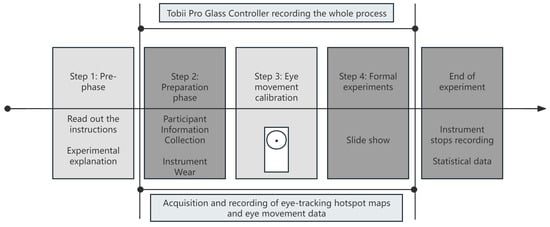 The scene diagram in Table 4 was used as the material for the 18-sheet visual experiment. In order to avoid the influence of color on location perception, the experimental scene was set in grey, the logo was a differentiated dark tone, and a blank page was used for the transition between each page. The research experiment is divided into four steps, and the specific flow is shown in Figure 8.