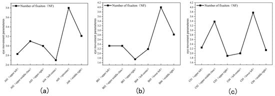 Statistics and comparison of indicators on the number of fixations; (a) Number of fixations (NF) for areas AO1 to AO6; (b) Number of fixations (NF) for areas BO1 to BO6; (c) Number of fixations (NF) for areas CO1 to CO6.