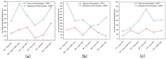 When looking through Figure 10, it can be noticed that the trend of the folds in the two charts (a) and (c) are similar. In these charts, the trends of TFF and DFF are synchronized. For example, in region A03, both TFF and DFF reach higher values, showing the stronger attraction of this region to observers. Regarding other regions such as A01, A06, etc., TFF and DFF show relatively consistent upward or downward trends, which indicates a strong correlation between visual attraction and dwell time in these regions [43]. However, the situation in (b) is different. Although the values of TFF and DFF varied from region to region, there was a clear divergence in their trends. For example, region B04 has relatively low TFF and a high DFF value, implying that although visual attention is rapidly focused, the dwell time is longer. Conversely, region B05 showed the opposite situation, with higher TFF and lower DFF, possibly indicating that although the observer’s initial gaze was more rapid, interest in the region did not last long [44].
