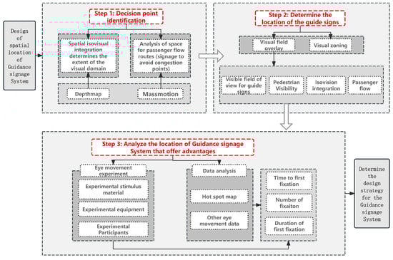 This study is divided into the following three steps: Firstly, three different transition spaces between the rail stations and their neighborhoods are selected as the experimental base scenarios based on existing cases and field research. Secondly, according to the research on the visual field of the Guidance Signage System, passengers’ visual perception, and the principle of ergonomics, the visual field simulation of different articulated spatial scenes using Depthmap10 and Massmotion11.5 is used to determine the location of the Guidance Signage System and improve the scene map of different spatial locations of the Guidance Signage System. Thirdly, a simulation experiment is conducted with the help of eye-tracking technology; the variability of the perceived degree of different sign placement locations is analyzed based on the eye-tracking data.