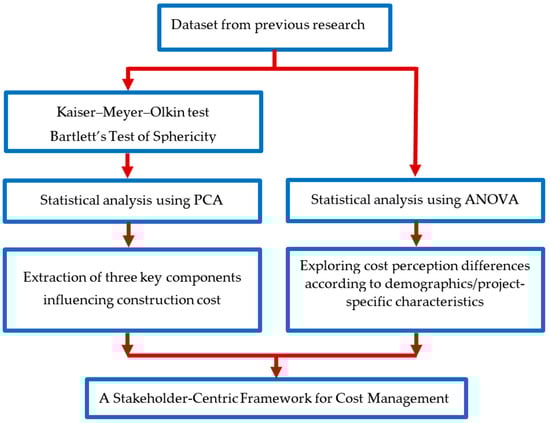 This research builds upon the 2024 study by Mosly, utilizing the same dataset collected through a questionnaire survey []. The previous study explored the individual factors influencing costs during the construction phase in Saudi Arabia [], whereas this study implements PCA and ANOVA to identify structured clusters of cost-influencing factors. The number of respondents who participated in this questionnaire survey were 1076 engineers working in the construction industry of Saudi Arabia []. The respondents were selected using stratified random sampling to ensure representation across different specialization, experience levels, and project types. The Research Ethics Committee at King Abdulaziz University exempted this study from ethical approval. Prior to beginning the questionnaire, participants were informed of the purpose of this study, and their consent was obtained. Data were anonymized to protect participants’ identities, and all responses were securely archived. The data analysis was conducted utilizing SPSS (Statistical Package for the Social Sciences), version 22. Figure 1 presents the methodology diagram followed in this research.