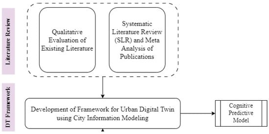 A qualitative literature review (in Section 2) preceded an SLR in accordance with the PRISMA workflow, where 105 Scopus-indexed papers were reviewed and analyzed and another 13 papers from a domain-specific keyword search were also reviewed and analyzed. A DT framework was proposed by integrating federated BIM models with GIS and linked with data streams through real-world sensing. Figure 1 below shows the research methodology workflow.