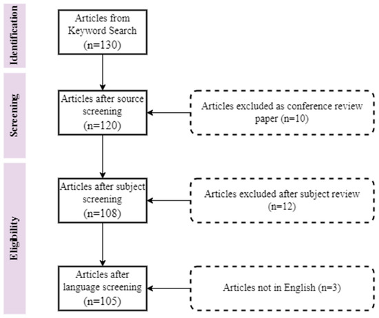 A total of 130 articles were identified. Documents in the search results included journal articles, conference proceedings, reviews, book series and books published between 2019 and 2024, suggesting the timeliness of this research. Ten conference reviews were excluded, leaving 120 valid results. Then after a subject-based evaluation, twelve articles not related to engineering, or the built environment were excluded. After excluding 3 articles that were not in English, 105 valid articles selected for review. Figure 3 shows the graphical illustration of this workflow.