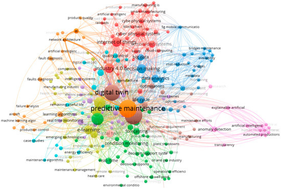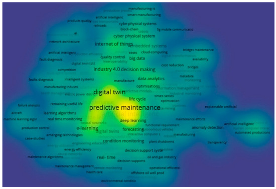Keyword co-occurrences were visualized using VOSviewer version 1.6.20 to evaluate links between keywords and illustrate the knowledge structure of results, intellectual provenance and indebtedness [49]. The two types of co-occurrence analyses used are cluster-based visualization and density visualization. In the cluster-based visualization, the nodes represent the keywords, and the connecting edges represent the intellectual links. Edge thickness indicates the strength of the relationships between keywords. Node sizes depend on the number of keyword co-occurrences. Keyword font sizes also indicate the level of keyword co-occurrences in the literature sample. Figure 4 shows a dense network of keyword co-occurrences, with PM being the most prominent keyword, followed by DT and then Industry 4.0. The three clusters closest to themselves are PM, DT and deep learning. This proximity is also evident in the density visualization in Figure 5.