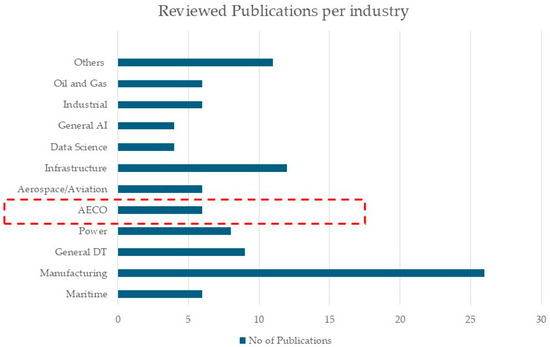 Nearly a quarter of the articles reviewed were in the manufacturing industry. Twelve articles were on transportation/infrastructure, nine were general DT studies and eight were on power generation. Only six papers were in the architecture, engineering, construction and operation (AECO) industry. This suggests a significant knowledge gap in the field. Figure 7 below shows a publication distribution chart with an emphasis on the number of publications in the AECO industry (at six publications) in comparison with other industries