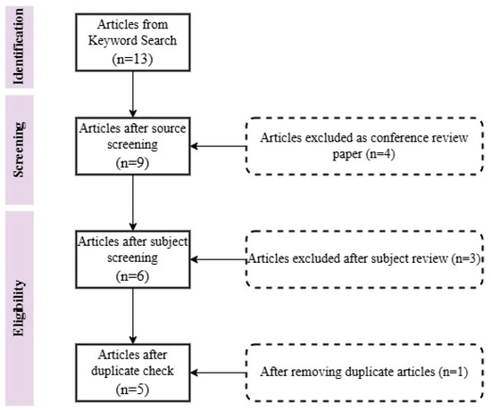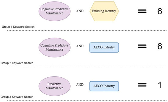 A narrowed keyword search on Scopus-indexed articles was conducted, which focused specifically on applications of predictive maintenance in the construction (AECO) industry and further revealed the need for more research efforts. Three keyword search groups were used. The first was “Cognitive Predictive Maintenance” AND “Building Industry” which yielded 6 results, of which only 3 were valid results after applying the same screening criteria as enumerated in Section 3.1 and Figure 3. The second search was with keywords “Predictive Maintenance” AND “Building Industry”, which also yielded 6 results. After screening and exclusion of duplications, only two results were valid for the study. The third keywords search was “Cognitive Predictive Maintenance” AND “AEC Industry”, which yielded 1 result that was not relevant to the study. Figure 8 and Figure 9 below illustrate the domain-specific keyword search process and SLR workflow.