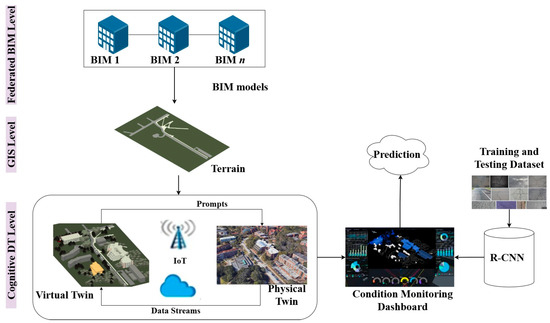 Predictive maintenance of built assets often relies on scheduled routine practices that are disconnected from real-time stress assessment, degradation and defects. However, while Digital Twin (DT) technology within building and urban studies is maturing rapidly, its use in predictive maintenance is limited. Traditional preventive and reactive maintenance strategies that are more prevalent in facility management are not intuitive, not resource efficient, cannot prevent failure and either underserve the asset or are surplus to requirements. City Information Modeling (CIM) refers to a federation of BIM models in accordance with real-world geospatial references, and it can be deployed as an Urban Digital Twin (UDT) at city level, like BIM’s deployment at building level. This study presents a systematic review of 105 Scopus-indexed papers to establish current trends, gaps and opportunities for a cognitive predictive maintenance framework in the architecture, engineering, construction and operations (AECO) industry. A UDT framework consisting of the CIM of a section of the University of Florida campus is proposed to bridge the knowledge gap highlighted in the systematic review. The framework illustrates the potential for CNN-IoT integration to improve predictive maintenance through advance notifications. It also eliminates the use of centralized information archiving.