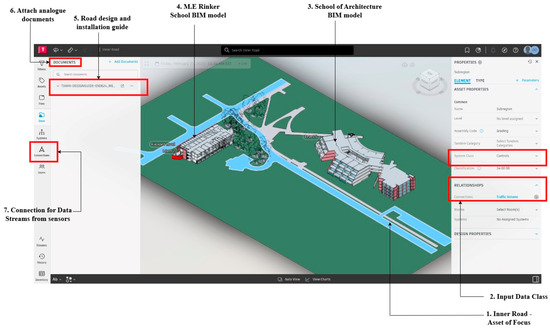 The BIM models are integrated into the Autodesk Tandem web-based DT platform. Figure 12 below is an Autodesk Tandem interface that shows the various features that enable data transfer from the physical twin to the digital twin, while Figure 13 illustrates the condition monitoring dashboard, which interprets the Tandem DT input to advise on the level of asset degradation and forecast maintenance requirements. Item 1 is the asset of focus, which is Inner Road, University of Florida campus. Item 2 is the input data class which displays the type of data introduced into the interface. In this case traffic volume data is fed through the connection tab in item 7. Item 3 is the BIM model of the School of Architecture which is uploaded into the CIM. Item for is BIM mode for M.E Rinker School of Construction Management. Item 5 is the road design and installation guide—an analogue document which describes the asset of focus. Item 6 is the document attachment tab while Item 7 is the connection tab for data streams from physical sensors.
