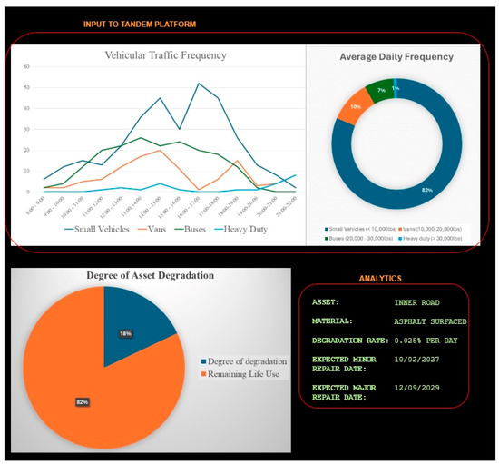 For virtual representation of physical entities to become intuitive, there is a need for data streams and data entry points from the physical twin to the DT [104]. This DT then sends information to the physical twin to impact conditions in response to the data received. This technology spans the lifecycle of an asset, using real-time simulation, AI and intuition to assist with decision making in the process [105]. The cognitive DT level in Figure 10 above illustrates the direction of information flow between physical and digital components by installing IoT sensors at critical points in the city. In this case, IoT sensors send traffic information ranging from types of vehicles to traffic volumes to the Tandem interface in Figure 12. This information goes into the condition monitoring dashboard. Based on codified logic, asset degradation information can be computed.