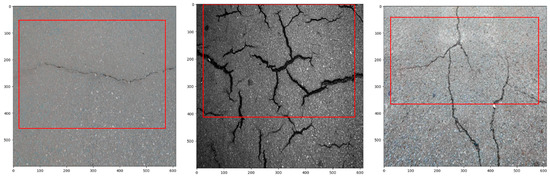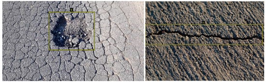 Labeled images of defective roads and sidewalks were the model input, while the output was the predicted bounding box of the identified defects in the images. The image dataset used was curated by the authors from images available online. The data were manually annotated, and 604 images were created for training and validation. The dataset was randomly split into 80% training data and 20% test data. Some examples of annotations are shown in Figure 15 with the defect within the box representing the defect which the model is trained to identify.
