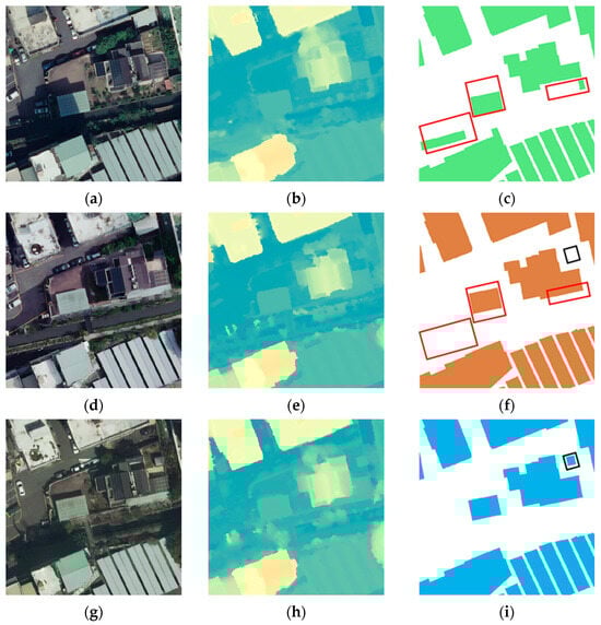- Generation of DSMs and true orthophotos. High-resolution DSMs and true orthophotos are generated through dense image matching to eliminate distortions and ensure accurate alignment. Traditional orthophotos (Figure 3a) are corrected using a digital terrain model (DTM), which only accounts for ground elevation. However, this approach does not consider the relief displacement caused by elevated structures such as buildings, leading to positional distortions in building outlines. This study adopts the image dense matching technique to generate a DSM that accurately represents surface elevation, including buildings, trees, and other structures. The DSM is then used to produce a true orthophoto (Figure 3b) [22,23], which provides a full nadir view, thereby eliminating the relief displacement of buildings. This process involves robust aerial triangulation, aligning images across different time periods using a consistent set of ground control points (GCPs) to ensure precise alignment of multi-temporal datasets. The aerial images used are cloud-free, ensuring clear and accurate data. Additionally, a mosaic image is generated by combining multiple source images captured from different viewpoints. This mosaic reconstruction effectively eliminates occluded regions, enhancing the completeness and reliability of the dataset. Consequently, the building edges are more precisely aligned, which improves the spatial accuracy of change detection. Figure 3c illustrates the differences between traditional and true orthophotos by overlaying their respective color bands. This visual comparison highlights the positional shifts caused by relief displacement, which can be effectively resolved in true orthophotos. The DSM (Figure 3d) is created using the image dense matching method, which identifies corresponding points between multi-view aerial images to calculate elevation values. Unlike a DTM, which only represents bare earth, a DSM considers all objects’ surface heights, including buildings and vegetation. The DSM plays a vital role in data preprocessing by providing critical elevation information for building change detection. It identifies changes in building height and helps differentiate newly constructed buildings from existing structures.