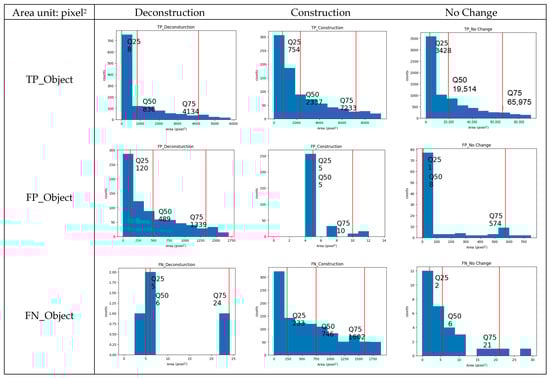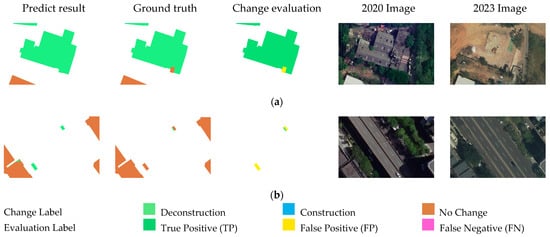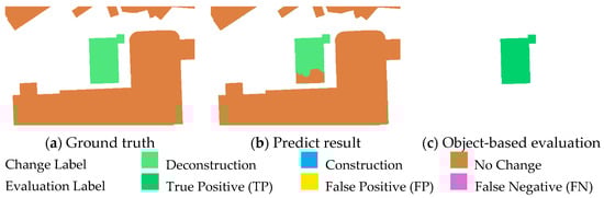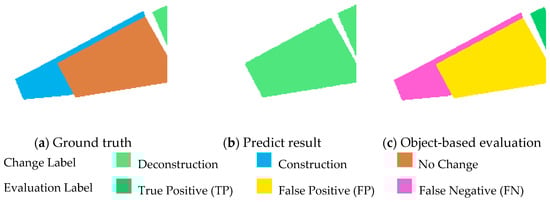 - A prediction was classified as a TP when the detected change aligned correctly with the ground truth label. For instance, if the model predicted “deconstruction” for a region where the ground truth also indicated “deconstruction”, this was considered a correct detection, a TP.