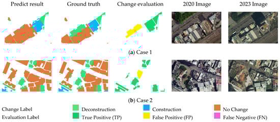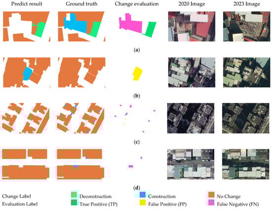 - Conversely, an FN occurred when the model failed to detect a change present in the ground truth. For example, if the ground truth indicated “construction” in a specific area but the model predicted “non-building”, the change was overlooked, resulting in an FN.