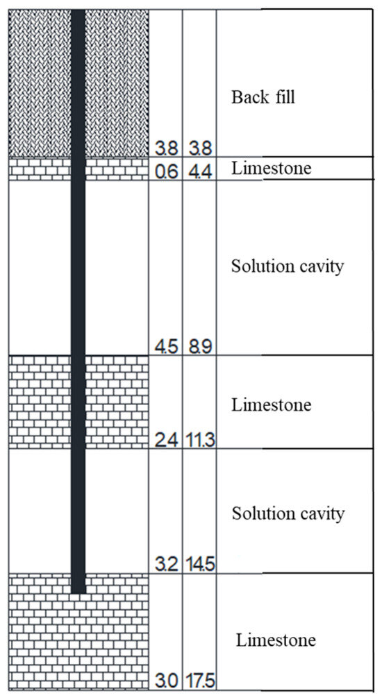 The project is located on the east side of the intersection of the entrance and exit of the Dunan Expressway in Mashan County, Nanning City, Guangxi Province, and the provincial highway 20324 line. The site landform is a karst basin. The geological materials are shown in Figure 1. The numbers on the left in Figure 1 represent the height of the sections themselves, and the numbers on the right represent the height of the bottom of the sections from the ground. The first layer is backfill soil with a height of 3.8 m. The density of backfill soil is 1580 kg/m3, the cohesion is 1.78 × 104 Pa, and the internal friction angle is 30.2°. The second layer is broken limestone with a height of 0.6 m. The third layer is a karst cave with a height of 4.5 m. The fourth layer is broken limestone with a height of 2.4 m. The broken limestone has a density of 2700 kg/m3 and an elastic modulus of 3.2 × 109 Pa. The fifth layer is a karst cave with a height of 3.2 m. The sixth layer is relatively complete limestone. The height of the pile is 15 m, and the most complete limestone is 0.5 m. The complete limestone has a density of 2700 kg/m3 and an elastic modulus of 5 × 109 Pa.
