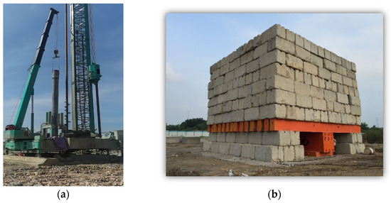 Pictures of the test site. (a) Process of implanting pile, (b) static loading process of pile foundation.