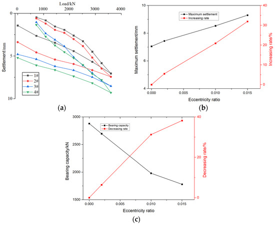 In the static load test of the vertical reinforcement of the foundation pile, the maximum load value of the test is 3600 kN, which is close to the maximum strength of the pile body. The selected four test piles of 1#, 2#, 3#, and 4# all show good bearing performance, which is in line with the bearing capacity characteristics of the pile foundation in continuous and complete soil layers. Among them, 1#, 2#, 3#, and 4# represent the eccentricity of the external load of 0, 0.002, 0.01, and 0.015, respectively. As shown in Figure 3a, the Q-s curve shows a slow-varying characteristic, and no obvious starting point of a steep drop is observed. In the unloading stage, the rebound of the pile top under the last load is significant, which is 5.62 mm, 4.06 mm, 3.73 mm, and 4.09 mm, respectively, which shows the large elastic deformation ability of the reinforcement during the loading process. After analysis, the ultimate bearing capacity of the reinforced body was determined to be 3600 kN, which did not reach its failure state, indicating that the pile has a high safety reserve. Figure 3b shows the variation trend of the maximum settlement of the pile foundation with the eccentricity of the external load. It can be seen from the diagram that when the eccentricity of the external load is 0, 0.002, 0.01, and 0.015, the maximum settlement values of the pile foundation are 7.05 mm, 7.44 mm, 8.53 mm, and 9.30 mm, respectively. Correspondingly, compared with the vertical loading, when the eccentricity of the external load becomes 0.002, 0.01, and 0.015, the maximum settlement of the pile foundation increases by 5.5%, 20.9%, and 31.9%, respectively. It can be found that as the eccentricity of the external load increases, the maximum displacement of the pile foundation increases significantly. In order to further explore the influence of external load eccentricity on the bearing capacity of pile foundations. When the settlement of the pile foundation is 6 mm, the corresponding external load is analyzed. As shown in Figure 3c, when the settlement of the pile foundation is 4.5 mm, the external loads corresponding to the 1#, 2#, 3#, and 4# pile foundations are 2880 kN, 2696 kN, 1980 kN, and 1780 kN, respectively. In other words, when the eccentricity of the external load is 0.002, 0.01, and 0.015, the bearing capacity of the pile foundation is reduced by 6.39%, 31.25%, and 38.19%, respectively, under the same settlement.
