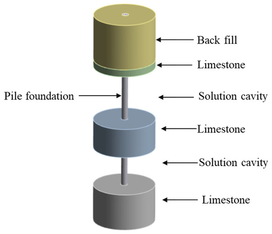 ANSYS has many advantages in simulating the bearing capacity of pile foundations in multi-layer karst caves. These advantages make ANSYS the preferred software in the engineering community when simulating complex geological conditions and pile foundation structures. Due to the special conditions of karst geology and most of the broken limestone around pile foundations, the stress mode of the pile used in this model is mainly the end force. The pile established by the finite element method has a 50 mm interval with the surrounding soil. The contact interaction between the pile body and surrounding limestone, soil layer, pile bottom, and underlying limestone is modeled as frictional contact, and the friction coefficient is 0 [7,8]. Using the method of surface contact in ANSYS Workbench 2021 R1 software, in general, the surface of the rigid part is used as the target surface, and the surface of the flexible part is used as the contact surface. The contact between the first layer of backfill soil and the second layer of broken limestone is set to bonded. Fixed constraints are set on the surfaces of soil and limestone and the bottom of the lowest limestone. Because the stiffness of the pile is much larger than that of the surrounding rock and soil, the pile is modeled as a linear elastic material, and the surrounding soil is set to be the ideal elastic–plastic model, and the Drucker–Prager model is used to reflect its elastic–plastic characteristics. Due to the small influence on the soil outside a certain range, soil with a diameter of 10 times the pile body is taken from a depth of 2.5 m under the pile body to establish the finite element model. The finite element model is shown in Figure 4, and the required material parameters are shown in Table 2. These material parameters are obtained through tests in the field of experimental testing.