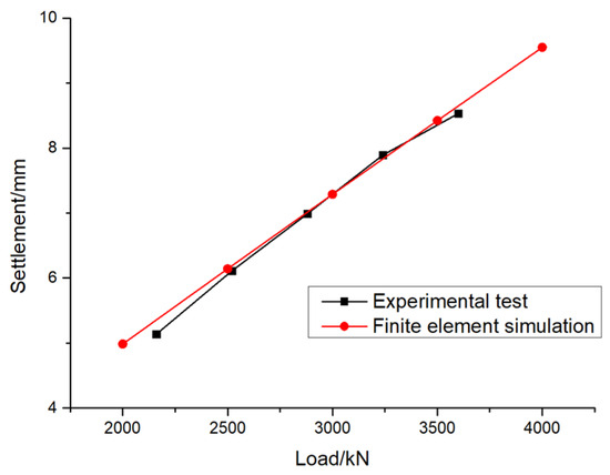 In order to verify the accuracy of ANSYS finite element calculation results, the results obtained by experimental tests and numerical simulations of pile foundations are compared. Figure 5 shows the settlement results of the experimental test and numerical simulation. It can be seen from the figure that the calculation results of the experimental test and numerical simulation are basically consistent, thus verifying the accuracy of the finite element model used in this paper.