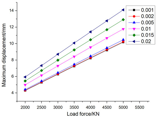 The maximum displacement of pile foundations under different elastic moduli and different loading forces (the eccentricity is 0.005).