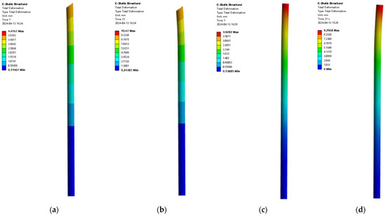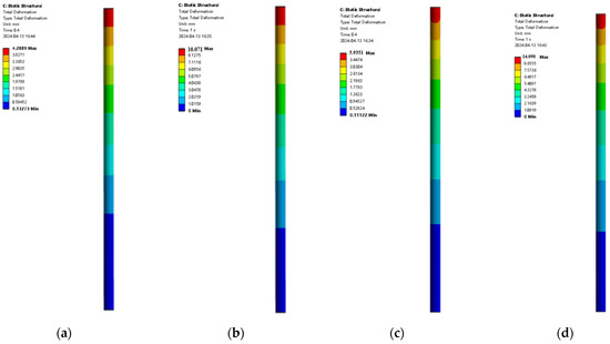The displacement contour of pile foundation under different eccentricities and different loading forces. (a) Eccentricity of 0.001, external load of 2000 kN; (b) eccentricity of 0.001, external load of 5000 kN; (c) eccentricity of 0.02, external load of 2000 kN; (d) eccentricity of 0.02, external load of 5000 kN.