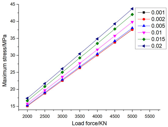 The maximum stress of pile foundations under different elastic moduli and different loading forces (the eccentricity is 0.005).
