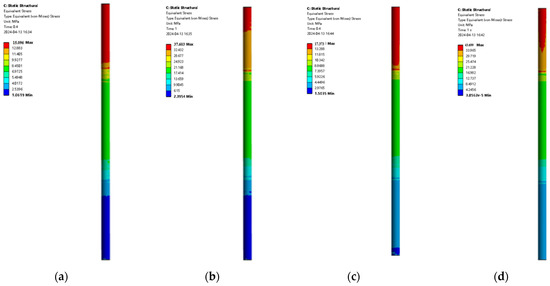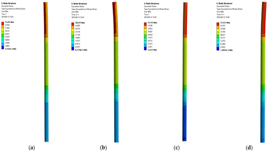The stress contour of pile foundation under different eccentricities and different loading forces. (a) Eccentricity of 0.001, external load of 2000 kN. (b) Eccentricity of 0.001, external load of 5000 kN. (c) Eccentricity of 0.02, external load of 2000 kN. (d) Eccentricity of 0.02, external load of 5000 kN.