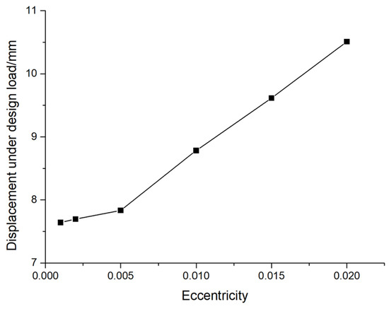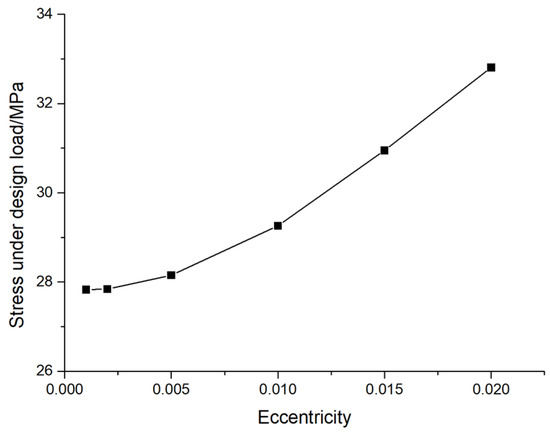 In order to study the performance of pile foundation under the design value of its vertical bearing capacity, the AB-type prestressed concrete pipe pile with an outer diameter of 500 mm and a wall thickness of 125 mm is taken as an example, and the displacement and stress under the design bearing capacity are calculated. The variation law of eccentricity is shown in Figure 10 and Figure 11. From the diagrams, it can be seen that the maximum displacement of pile foundations increases with an increase in the eccentricity, and the slope of the change curve also increases; i.e., the rate of the increase in maximum displacement also increases with the increase in the eccentricity. When the eccentricity is 0.001, 0.002, 0.005, 0.01, 0.15, and 0.02, the maximum displacements at the design load are 7.64 mm, 7.70 mm, 7.83 mm, 8.78 mm, 9.62 mm, and 10.51 mm, respectively. At the same time, the stress of the pile foundation also increases with the increase in the eccentricity, and the slope of the change curve also increases; that is, the increase rate of the stress also increases with the increase in the eccentricity. When the eccentricity is 0.001, 0.002, 0.005, 0.01, 0.15, and 0.02, the stress at the design load is 27.83 MPa, 27.84 MPa, 28.15 MPa, 29.26 MPa, 30.95 MPa, and 32.21 MPa, respectively. The variation in displacement and stress with eccentricity is consistent with the law observed in Figure 6 and Figure 8. The reason for the above phenomenon is that there is a 50 mm interval between the pile body and the soil boundary. The reason for the above phenomenon is that when the eccentricity is small, the bottom rock embedded in the pile foundation resists the external force, and its deformation does not contact the surrounding soil. When the eccentricity is large, the pile foundation bears a large lateral load, which will contact the surrounding soil, resulting in the above change law.