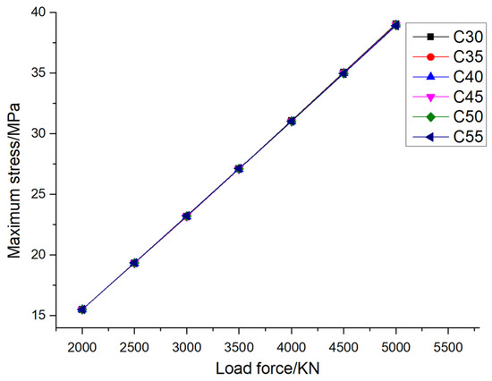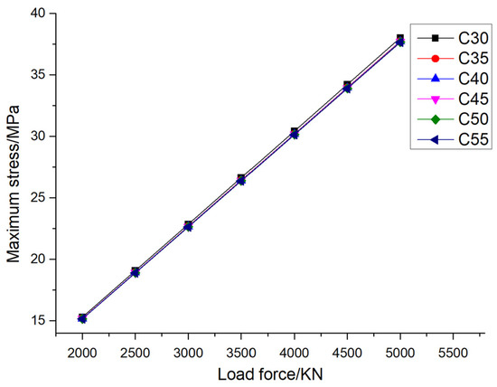 Figure 13 shows the variation in the maximum stress of pile foundations with the material properties of pile foundations themselves under different loading conditions when the eccentricity is 0.005. It can be seen from the figure that when the pile foundation material is determined, the maximum stress of pile foundations increases with the increase in loading. Taking the pile foundation material C30 as an example, when the external load is divided into 2000 kN, 2500 kN, 3000 kN, 3500 kN, 4000 kN, 4500 kN, and 5000 kN, the maximum stress of the pile foundation is 15.30 MPa, 19.10 MPa, 22.85 MPa, 26.64 MPa, 30.43 MPa, 34.23 MPa, and 38.03 MPa, respectively. Different from the change law of the maximum stress of pile foundations, when the external load is determined, the maximum stress of pile foundations remains basically unchanged with the increase in the elastic modulus of pile foundation material. Taking an external load of 2000 kN as an example, when the pile foundation materials are C30, C35, C40, C45, C50, and C55, the maximum stresses of the pile foundation are 15.30 MPa, 15.18 MPa, 15.17 MPa, 15.16 MPa, 15.15 MPa, and 15.14 MPa, respectively. Taking an external load of 5000 kN as an example, when the pile foundation materials are C30, C35, C40, C45, C50, and C55, the maximum stress of the pile foundation is 38.03 MPa, 37.75 MPa, 37.72 MPa, 37.70 MPa, 37.68 MPa, and 37.66 MPa, respectively. When the external load is determined, the maximum stress of pile foundations has little to do with the strength grade of the concrete and does not belong to the main influencing factor. The phenomenon described above occurs because when the geometric dimensions of the pile foundation remain constant, the primary factor influencing the stress it experiences is the external load applied to it. During the elastic deformation phase, the elastic modulus of the pile foundation material has a minimal impact on stress levels. It is important to note that deformation, which is a measure of how much an object changes in shape or size, is dependent on both the strain and the length of the material. Specifically, deformation is equal to the product of these two factors. Furthermore, when the stress remains constant, an increase in the material’s strength can lead to a reduction in its strain, which in turn decreases its deformation.