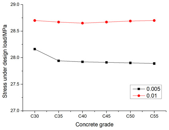 The variation law of pile foundation stresses with concrete grade under design load.