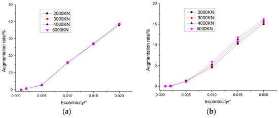The augmentation rate of (a) maximum displacement and (b) maximum stress of pile foundations under different eccentricities and different loading forces.