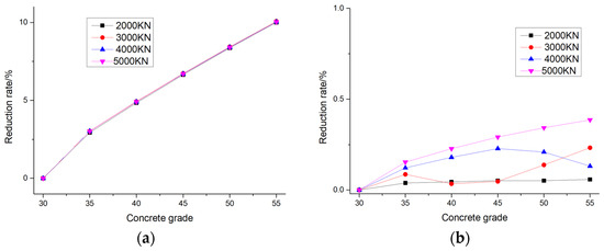 The reduction rate of (a) maximum displacement and (b) maximum stress of pile foundations under different concrete grades and different loading forces.