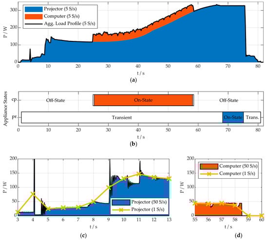 Challenges in event and state definition: (a) shows the aggregated active-power load profile of a projector and a computer with a resolution 5 S/s. (b) shows one possible definition of the appliances’ states and transients. Furthermore, sections of the individual operational behavior of the projector (c) and the computer (d) are illustrated with resolutions of 1 S/s and 50 S/s.