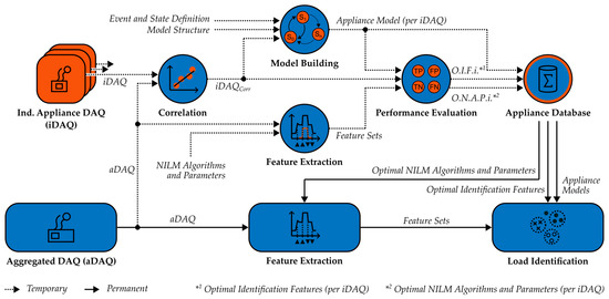 The lower part of Figure 3 shows the general NILM framework, as described in the literature (see also Figure 1), consisting of the steps aDAQ, feature extraction, and load identification, as well as the appliance database. This process is referred to as permanent, in contrast to the upper part of Figure 3, containing the temporary learning phase. In this phase, the appliance database is built for the permanent NILM framework. The methodology allows the parametrization, optimization, and performance evaluation of existing NILM algorithms, depending on a congruent event and state definition, a specific appliance model structure, as well as aDAQ and iDAQ measurement data. The resulting NILM algorithms and parameters, identification features, and appliance models are optimized regarding the sampling rates, data resolutions, features, and measurement data and quantities used. In the temporary learning phase, the iDAQ of individual appliances is carried out, parallel to the aDAQ of a certain quantity of appliances, e.g., of a building or a building section. In Figure 3, the temporary learning phase is displayed for the iDAQ of one appliance. The results are stored for all conducted iDAQs in the appliance database.