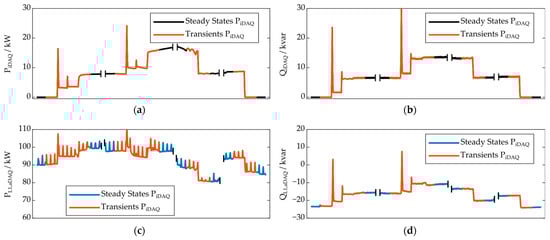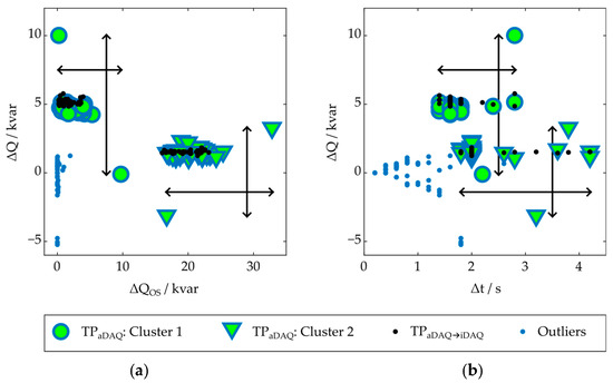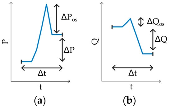 Certain features were extracted from the events, detected by each algorithm–parameter variant, individually. These features are shown in Figure 4 for a rising event in active power and a falling event in reactive power. As features, we used the absolute delta of the detected events in the measured quantity; the algorithm was applied to (ΔP and ΔQ), the absolute value of the overshoot beyond the absolute deltas (ΔPos and ΔQos), and the duration of the detected events (Δt).