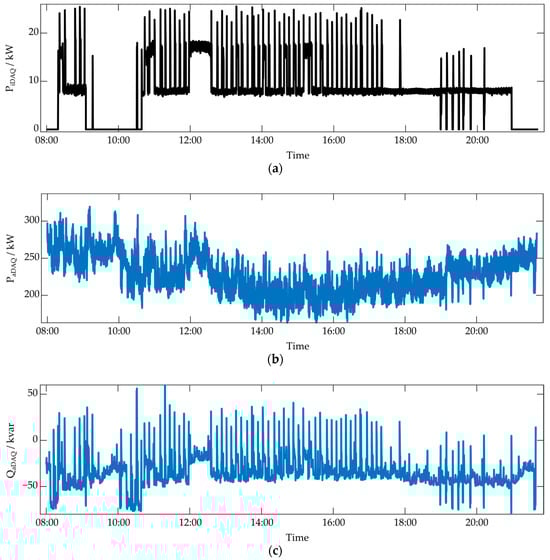 For the demonstration of the functionality of the general methodology in Section 4, certain specifications and ascertainments were made for DAQ and correlation. Those are described in the following. Table 1 contrasts the general methodology and the application methods for the correlation step. For the application, we performed three-phase aggregated measurements of the energy consumption of a university building at Munich University of Applied Sciences (MUAS), as well as single-phase individual appliance measurements of a building refrigeration plant, using the measurement quantities U, P, and Q with a resolution of 5 S/s. The original measurement data can be found in [49]. The appliance is a balanced three-phase consumer, therefore a single-phase iDAQ is sufficient for load identification using the presented methodology, as is shown in this work.