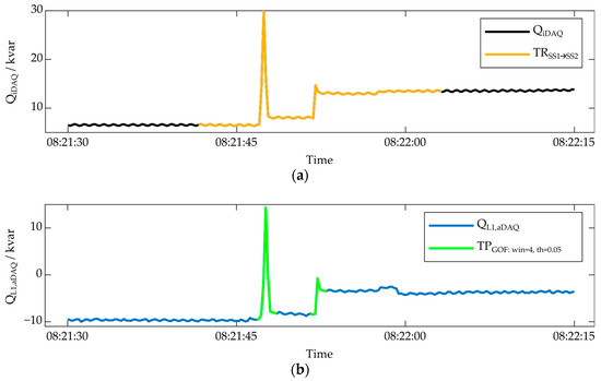 As described above, this procedure was carried out for two event detection algorithms (χ2-GOF and DSC), applied to two measurement quantities (PaDAQ and QaDAQ) and the phases L1, L2 and L3, using predefined input parameter sets for window sizes and thresholds. The performance of the resulting algorithm–parameter variants was evaluated for specific transient types, individually. These transient types were TRSS0→SS1, TRSS1→SS2, and the two transient types TRSS1→SS0 and TRSS2→SS1 combined. In Table 5, the algorithms, measured quantities, transient types, and parameter sets used in this work are listed. The parameter sets for the window sizes and thresholds were determined, based on literature recommendations and iDAQ data, to cover the entire reasonable result space.