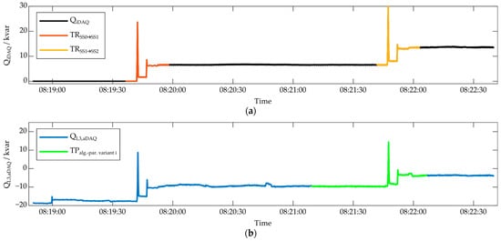 For the combination variant Q-variant I, the single best-performing algorithm–parameter variants for the measurement quantity QaDAQ on the phases L1, L2, and L3 were evaluated and combined. All three variants achieved a TPR = 100% and 0 FPs on the learning day individually, yet not on the two test days. For Q-variant II, the best-performing variants with small window sizes and low thresholds were selected. The algorithm–parameter variants of Q-variant I and Q-variant II can also be seen in Figure 12 for QL3,aDAQ. For the P-variant, all 1058 algorithm–parameter variants using the measured quantity PaDAQ (on L1, L2 or L3) and achieving TPR = 100% on the learning day were selected and reduced by those with TPR < 100% on the test day with appliance operation. The resulting 830 variants were combined. The identified feature limits on the learning day are also listed in Table 6, except for the P-variant, due to the large number of variants.