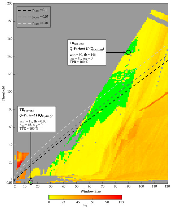 Figure 12 shows the performance of the algorithm χ2-GOF, applied to QL3,aDAQ, for the identification of the transient type TRSS1→SS2, as an example. The parameter window size was varied between 2 and 120, and the threshold between 0.01 and 200, according to the parameter sets, listed in Table 5. Every data point represents one algorithm–parameter variant of the parameter set. The TPR of the algorithm–parameter variants, located in the gray areas, was lower than 100%. For other algorithm–parameter variants, nFP is displayed in color. Green variants achieved 0 FPs on the learning day. Two of these variants are marked in the figure (Q-Variant I and Q-Variant II), to be further investigated in Section 4.4.