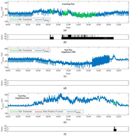 As mentioned before, Figure 13 shows the identification results of the three named combination variants. For illustration purposes, the measurement parameter PaDAQ, as an addition of PL1,aDAQ, PL2,aDAQ, and PL3,aDAQ, is shown for the learning day Figure 13a and the two test days Figure 13c,e. In Figure 13b,d,f, the operation behavior of the refrigeration plant is displayed for the three days. It can be seen that all three combination variants were capable of identifying all transients of the type TRSS1→SS2 (green transients). The P-variant, consisting of a combination of 830 single algorithm–parameter variants, still shows one FP on the second test day, marked in red.