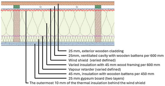 Figure 1 illustrates a horizontal cross-section of the wood frame wall in this study. The placement of the wind shield and the vapour retarder is highlighted. Additionally, the analysis area of interest is highlighted, which was the outermost 10 mm of the thermal insulation layer. This exterior wood frame wall was thermally insulated with different insulation thicknesses to reach a thermal transmittance of 0.10 and 0.15 W/(m2·K), the latter representing the minimum insulation requirement specified by the Danish building code [].