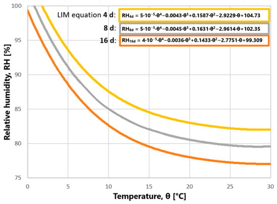 Lowest Isopleth Substrate Group I criteria []. Curves representing 4, 8, and 16 days [] with deduced associate curve equations. Group I encompass biologically degradable construction materials.