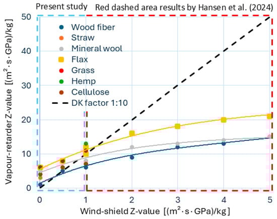 Necessary vapour-retarder Z-value as a function of the wind-shield Z-value. The results are obtained for wall U-value of 0.15 W/(m2·K), exposed to indoor humidity class 3, for various biobased thermal insulation materials and mineral wool. The area indicated by the blue dashed line are results from the present study, while the area indicated by the red dashed line represents results obtained by []. Of note, hemp was only examined by [] and is included for comparison.