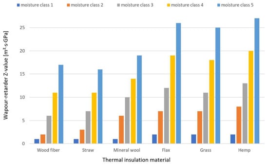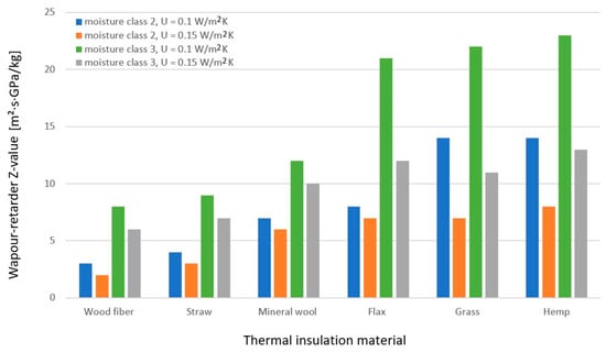 In terms of different thermal insulation materials and their effect on the necessary vapour-retarder Z-value, depending on the wind-shield Z-value, the results vary between the different thermal insulation materials. The lowest necessary vapour-retarder Z-value was observed for wood fibre used as thermal insulation, and the highest necessary vapour-retarder Z-value was observed for flax used as thermal insulation, as reported by []. The necessary vapour-retarder Z-value using mineral wool as thermal insulation was roughly similar to that of cellulose as thermal insulation; this was also slightly higher than wood fibre and straw but lower than flax, grass, and hemp as thermal insulation.