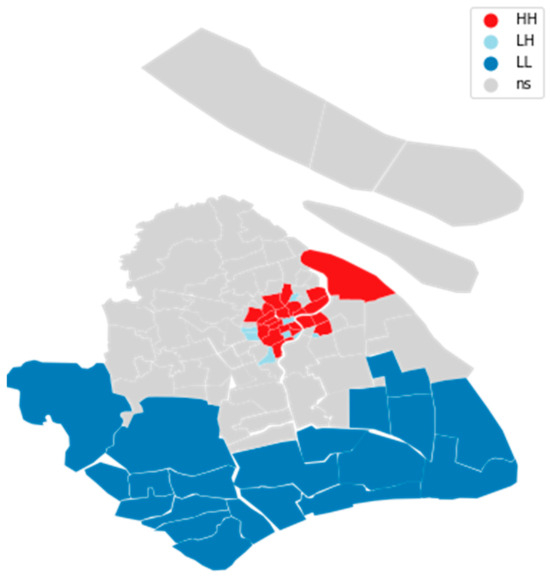 In 2021, Shanghai experienced significant spatial segmentation, where the spatially autocorrelated high–high clustering areas are always concentrated in the city core, but the low–low cluster appeared in the southern fringe of Shanghai (