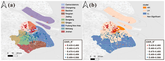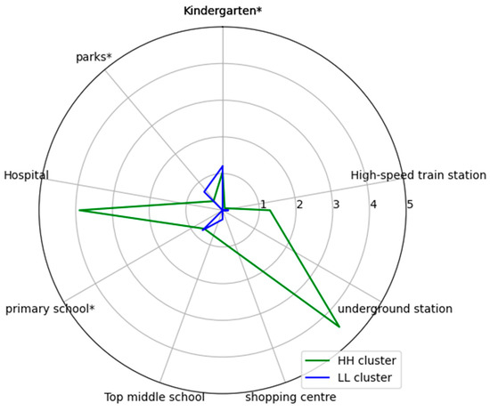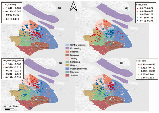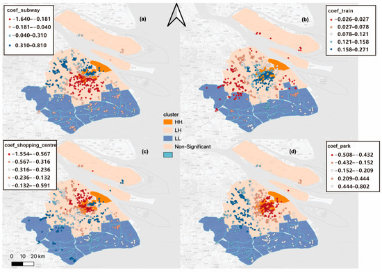 71]. The OLS and GWR models both indicate that the distance to the shopping centres is the only factor that has an overall positive effect on house prices. In different regions, the effect of shopping centres all shows the highest premium. More specifically, developments in the high–high cluster (urban core) are always the hot spots of the housing market, as they are equipped with superior urban facilities and accessibility. This cluster always has the highest demand for service amenities such as parks and shopping centres and the lowest demand for underground stations, indicating that a ‘gentrification’ region is formed as people are more concerned about spending and entertainment than meeting their basic needs (public transport).