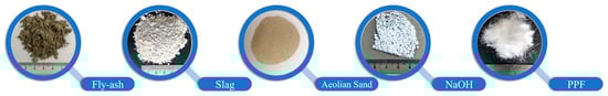 In the preparation process of fiber-reinforced ecological-matrix-cemented aeolian sand material, the aeolian sand was acquired from the Zhang Wu area of Liaoning Province. Natural aeolian sand has a poor gradation, and the particle size is mainly concentrated between 0.63 and 0.92 mm; the inhomogeneity coefficient is Cu3.745, while the curvature coefficient Cc0.821 [36]. Due to the collision and friction between particles caused by wind transport, the angular particles gradually tend to be rounded, and the surface of the particles is smooth. The fly ash was obtained from Rong Changsheng Environmental Protection Material Co., Ltd. (Zhengzhou city, China). The blast furnace slag was purchased from Henan Zhengzhou Yuanheng Environmental Protection Engineering Co., Ltd. (Zhengzhou, China) The chemical composition is indicated in Table 1, and the physical and mechanical characteristics of the slag are reported in Table 2. Polypropylene fiber was purchased from Shandong Shuntong Engineering Materials Co., Ltd. (Ji’nan, China); it is white, translucent, and has a bundled monofilament structure. The basic material was a synthetic fiber known as a polymer hydrocarbon; Table 3 lists its mechanical and physical characteristics. Figure 1 displays the materials that were used for the test.