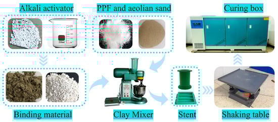 Fiber-reinforced eco-matrix-cemented materials were prepared using fly ash and slag as cementitious materials and aeolian sand particles as fine aggregates. The specimens were prepared according to the mix ratios in Table 4. According to the specified test ratio, cementitious material, aggregate, alkali activator, and water were weighed out. First, sodium hydroxide and water were mixed in proportion and stirred evenly to ensure complete mixing. Preparing and cooling the alkali activation solution to room temperature prior to use was necessary due to the exothermic dissolution process and the impact of temperature on the test. The two types of cementitious materials were mixed and stirred for 3 min. They were then gradually added to the mixer containing aggregates and fibers and stirred for another 3 min. Subsequently, the prepared alkali activation solution, once cooled, was added and stirred at a uniform speed for 3 min. Both cementitious materials were used at room temperature. Ultimately, the well-blended substance was put into two molds: one round mold, which had a 50 mm diameter and a 100 mm height, and one rectangular mold, which had dimensions of 160 mm by 40 mm by 40 mm. Following the vibrating process, it was left in the curing box for 24 h to remove the mold, and we then put the sample into a standard curing box (the temperature was kept at 20 ± 2 °C and the humidity was kept at about 90%) for 28 days. Figure 2 depicts the particular procedure.