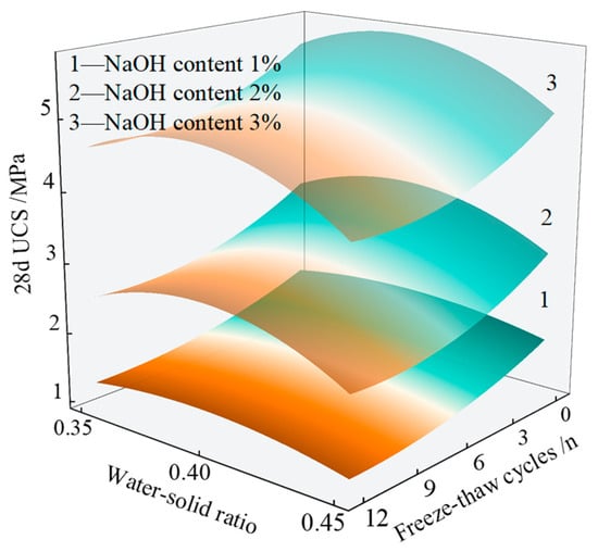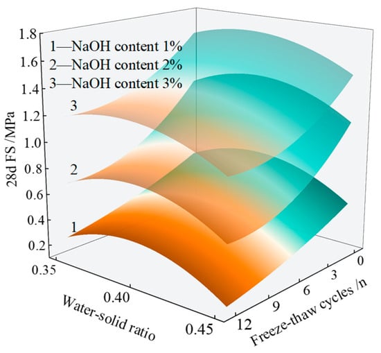 It can be observed from Figure 5 that when the NaOH content is 3%, sample S8 reaches maximum compressive strength when the number of freeze–thaw cycles is 0. Under the same conditions, sample S8’s compressive strength increases by 3.66 Mpa compared with that of sample S2 when the NaOH content is 1%. The relationship between the sample flexural strength and the amount of NaOH is shown in Figure 6. Based on the water–solid ratio of the sample of 0.4 and the number of freeze–thaw cycles of 0, when the NaOH amount is 1%, the S2 sample’s flexural strength is 0.73 Mpa. When the NaOH amount increases to 3%, the flexural strength of the sample (8) increases to 1.69 Mpa, an increase of 131.51% year-on-year. Combined with Figure 5 and Figure 6, it was identified that, within the scope of this experimental study, with the increase in NaOH content, the compressive and flexural strengths of the sample showed a gradually increasing trend. This is because, when the NaOH content is small, the driving force of the polymerization reaction process is insufficient, and the degree of polymerization of the generated product is small, resulting in a lack of density in the material structure after hardening. With the NaOH content increases, the pH in the polymerization reaction environment increases. This higher pH solution environment promotes the dissolution of Ca, Si, Al, and other elements, such that more gray bodies dissolve to form silicate and aluminate monomers, accelerate the polymerization reaction speed, and increase the reaction intensity, thus generating a more hydraulic cementitious matrix, and the ultimate compressive capacity is Improved [38,39].